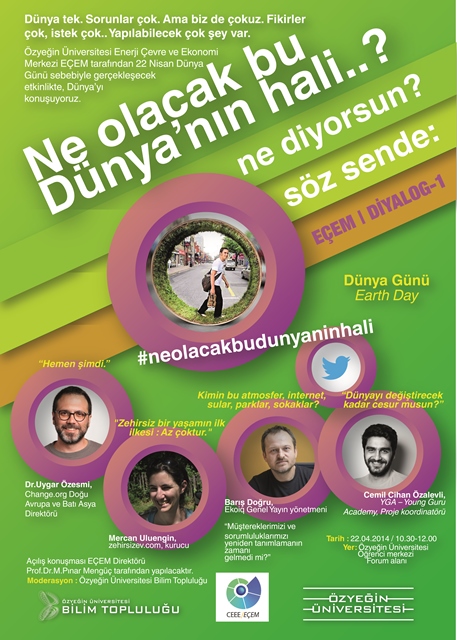 Özyeğin Üniversitesi Enerji, Çevre ve Ekonomi Merkezi/EÇEM olarak, Dünya’nın geleceği için sivil katılımın önemine dikkat çeken bu önemli günde bireysel olarak neler yapabileceğimizi konuşmak üzere bir etkinlik düzenliyoruz. Bilim Topluluğu’nun katkılarıyla düzenlediğimiz “Ne olacak bu Dünya’nın hali..?” başlıklı etkinlik 22 Nisan Salı günü Öğrenci Merkezi Forum alanında gerçekleşecektir.